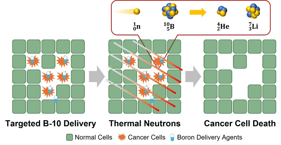 硼中子俘获疗法(BNCT)的概念最早由Locher于1936年提出。该疗法属于二元靶向放射治疗,依赖两个核心组分:中子束和富含10B的药物。其原理是利用稳定同位素10B在热中子辐照下发生的核反应,释放高能α粒子和7Li原子核,从而选择性杀伤肿瘤细胞,同时保护邻近的正常组织。